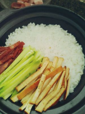 忘记拍照了、把所有食材分别炒熟码放到米饭上、(根据自己喜好加入调料炒熟)然后煎一个蛋、个人喜欢这种不太熟的、那个煮蛋是给儿子的!