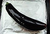 洗净的茄子在表面刷一层薄油,,整个放进铺好锡纸的烤盘里。烤箱预热200度,烤盘放倒数第二层,上下火烤20分钟。