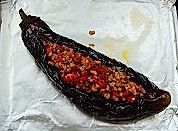 烤好的茄子拿出来(用手指按一按,茄子变软就可以了),用刀在茄子表皮划开,这时茄肉很软很酥,倒入调好的肉酱,撒上葱花即可。吃的时候把茄子肉和肉酱搅拌一下,很香很香的。