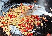 加入青红椒末和洋葱末拌匀,再加入盐、糖、蚝油、黑胡椒拌匀;