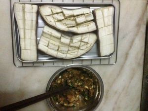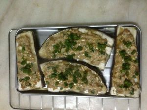 取出烤盘,将茄子扒开,将肉末、蒜泥、姜蓉、盐、糖、鸡精、生抽、油、少许水拌均匀抹进茄子里,再入烤10分钟,烤到茄肉软软烂烂时取出来,撒点葱花、香油,就可以了。