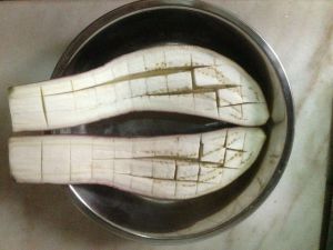 茄子用刀在中间破开,划十字花刀,然后放进微波炉里转两分钟,让茄子变软。