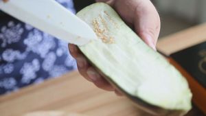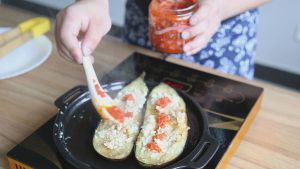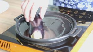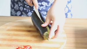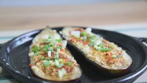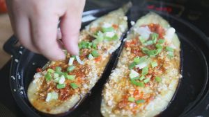 等待过程中,将酱料准备好。4⃣️最后5分钟将茄子取出,中间切开,里面用刀随意划上几下。(划几下是为了更加入味)