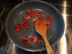 另取一锅,倒入少许橄榄油,热油,然 后加入葱姜炝锅,出香味后,将烤好的培根和牛肉倒入翻炒,加入料酒,继续翻炒,然后加入老抽上色、加入生抽调味,翻炒均匀。
