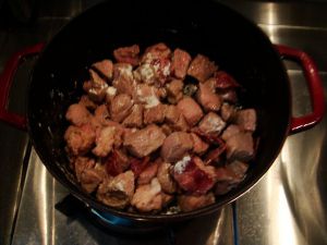 将煎好的牛肉培根和放入铸铁锅,加入少许盐和面粉,拌匀。