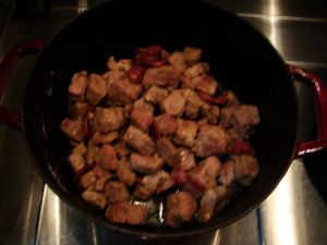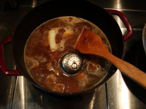 将炒好的牛肉和培根转移到铸铁锅里面,加入热水没过肉,大火烧开,将葱段、姜片和肉桂、八角、香叶放进去,转小火。盖上盖子焖煮1小时,然后加入切成滚刀块的土豆,再炖30分钟。最后根据口感,适度加入盐。
