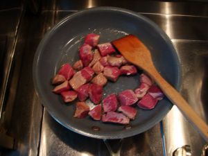 牛肉洗净擦干,切成4cm见方的小块。培根切成条。烧水煮开后,将培根条煮10分钟,然后捞出擦干水份备用。