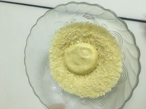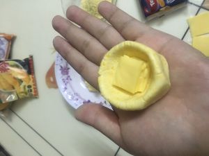 揪一团米团,中间压成碗状,放入掰碎的芝士片。封口。