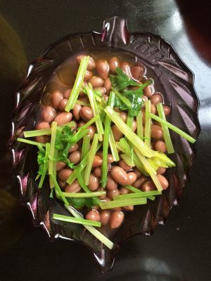 把凉下来的花生捞出装盘,放上备用芹菜,洒上麻油。凉拌花生完成。