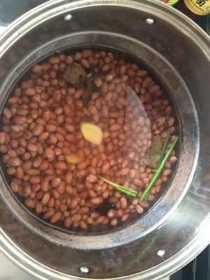 把八角、香叶、花椒、盐和花生一起大火高压煮5分钟