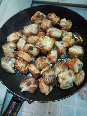 放入白砂糖30克和腌制好的排骨不停翻炒。