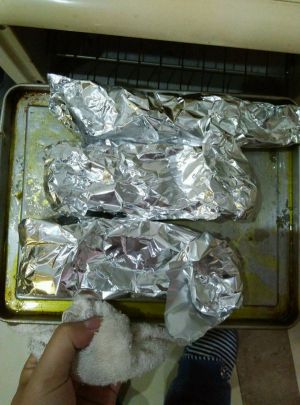 把羊排放烤盘上,上面盖上铝箔纸送进预热好的烤箱,210度烤1小时就可以了