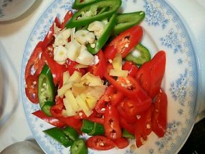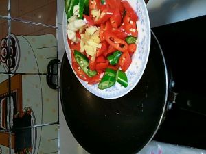 青红辣椒斜切刀,适量姜丝,蒜瓣备用