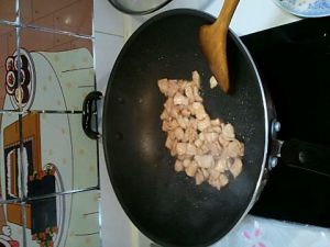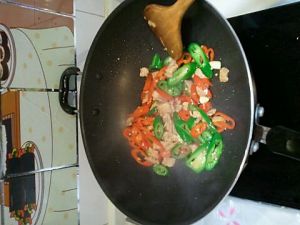 盛出青红辣椒,然后放油,待油锅热后下五花肉,待肉有焦色后放入料酒去腥,加盐少许,加生抽。