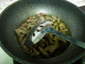 放入锅中爆炒三分钟(盐、味精、鸡精、白芝麻、生抽、干辣椒、蒜)