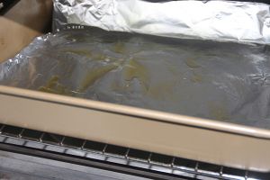 烤盘垫锡纸,锡纸哑光面朝上,刷上1小勺橄榄油,送入烤箱一起预热,230度,上下火,热风循环。