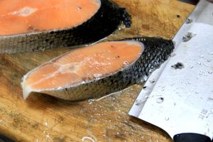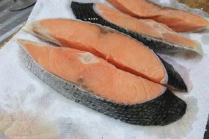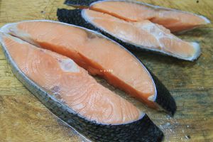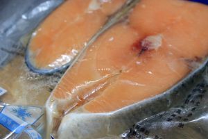 冰冻的三文鱼排提前放冷藏室自然解冻。
