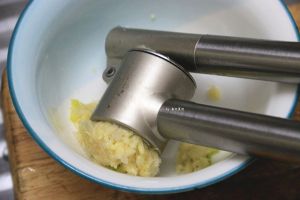 蒜去外衣,用压蒜器压成蓉放碗里备用。