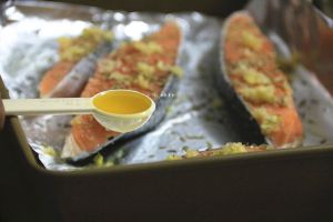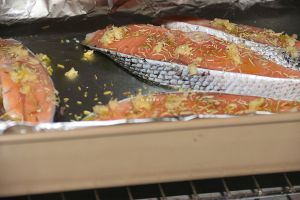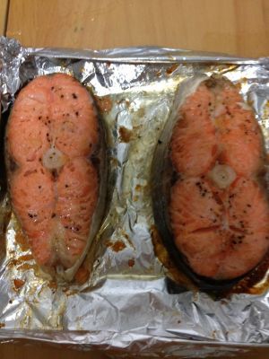 烤盘垫上锡纸 将三文鱼放入 撒上少许盐和黑胡椒粒(两面) 腌制半小时