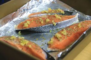 三文鱼淋上橄榄油,放入蒸烤箱内
