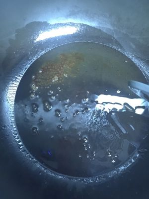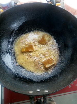 锅里油烧热放糖,烧至成糖浆