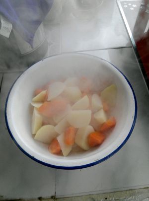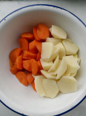 将土豆和胡萝卜切成滚刀块
