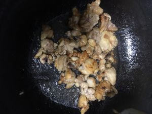 倒入鸡块快速翻炒上色(鸡块提前用冷水下锅绰一水,去去血沫)