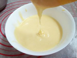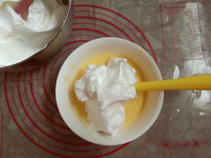 混合:取三分之一蛋白霜至蛋黄糊中,用翻拌手法混合,第一次混匀后继续抽打检查蛋白霜至细腻,将蛋黄混合液全部倒入蛋白霜盆中,轻轻翻拌均匀