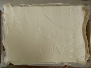 均匀地涂抹卡士达黄油馅。起始边抹齐,末端少抹甚至不抹。