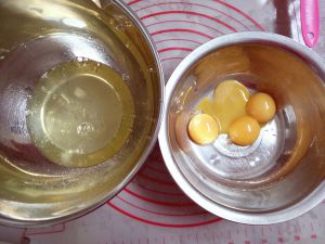 鸡蛋分离出蛋清和蛋黄,蛋清分离到一个干净的无水无油的盆中,蛋黄分离到面糊盆中,蛋清中不要有蛋黄掉入,否则会影响蛋清的打发。