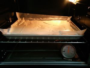 倒入铺有烘焙纸的烤盘中,稍抹平,敲一下烤盘底部,震出一点气泡,马上放入200度预热的烤箱中层,8-10分钟,表面呈金黄色即可。