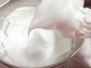 蛋白分3次加入细砂糖,打至捞起可以流动,滴落的形状可以在蛋白上保持不变(湿性发泡前的状态)。