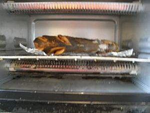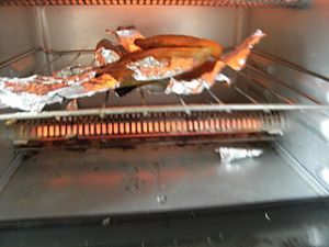 先烤鱼头部分,二百一十度烤二十分钟,中间要翻几次。