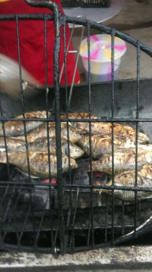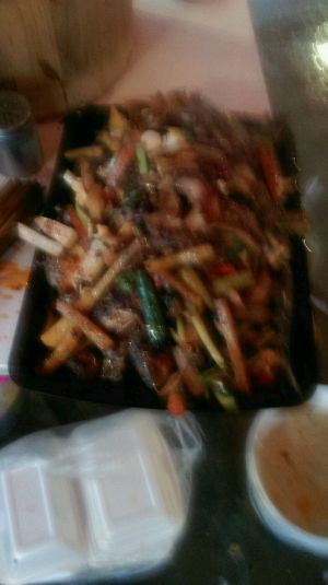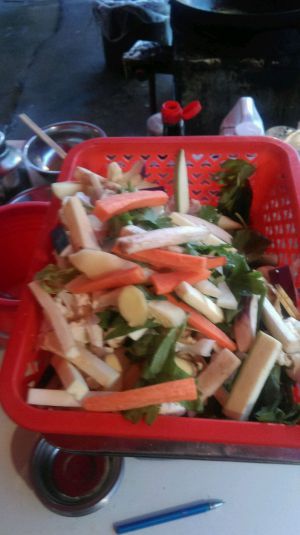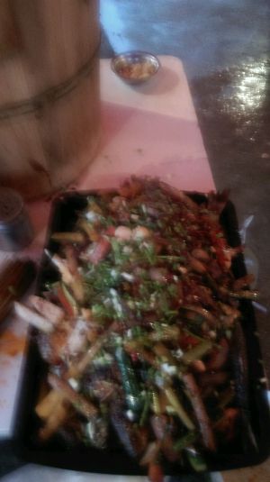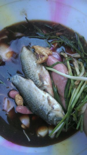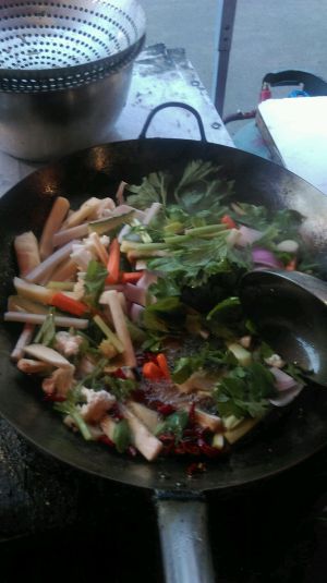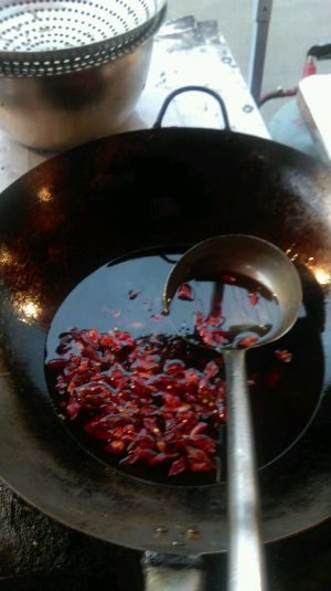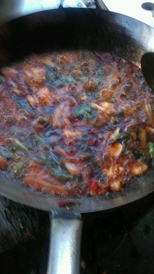 底料炒好后加入刚才焯水的全部配菜,翻炒一分钟左右,加入泡好的粉条,再炒一分钟,加入炸好的花生米。出锅,浇在刚烤好的鱼上。
