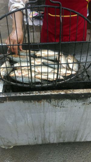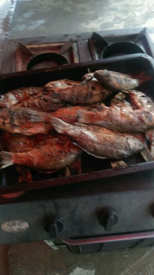 鱼洗净,两侧打花刀,用盐、料酒腌制半小时,加两三片柠檬可以去腥。腌好后,入烤箱,200度,烤30分钟,烤好后出烤箱备用。