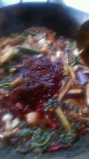烤鱼的功夫,我们准备其他食材。藕片、西兰花、平菇、青笋、木耳、黄豆芽下水焯一下,最好分开焯,这几种食材焯水时间不同,豆芽青笋都焯一分钟,其他2分钟。 焯水后炒底料:热锅加入两大勺油,油要宽,五成热炸花椒和麻椒,炸香后捞出,用炸椒的油作底油,加入姜片四五片、蒜瓣十瓣作用,朝天椒三个,干辣椒、泡椒若干,爆香。爆香后放入一大勺郫县豆瓣、加料酒、生抽、蚝油,加一大勺泡椒水(这个很提味),翻炒后加一碗开水。