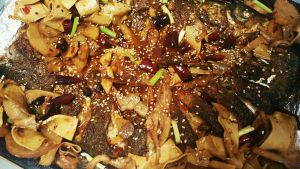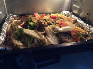切好配菜,放多点油爆香姜片,老干妈,吃辣的可以加点红辣椒,放下配菜,加入酱油,盐,水炒熟,倒进烤盘里。