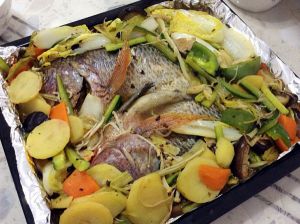 烤箱里的鱼好了,把配菜连汤一起到入烤盘(为了好看,我把配菜放鱼身下,用汤汁把鱼浇了一遍),在放烤箱烤10分钟就好拉