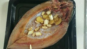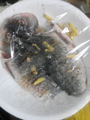 鱼洗干净,切开,可以平铺又不断皮,加生抽,老抽,盐,料酒,腌制20分钟以上,肚子和背上放上姜片和大蒜叶
