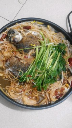放上烤鱼,继续加热,我用的是不粘锅,可以插电的,记得小火哦,就像碳烤鱼一样,汤汁是沸腾的,一切都是越来越好吃哦,太下饭了