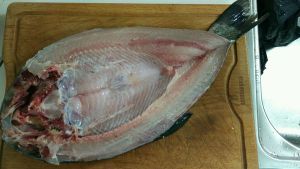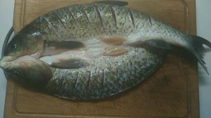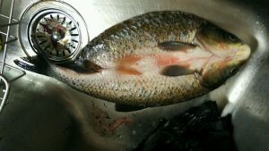 里外洗干净,特别是鱼肚子里的黑皮,必须洗干净,不然很腥。再把鱼用剪刀剪成图片这样。