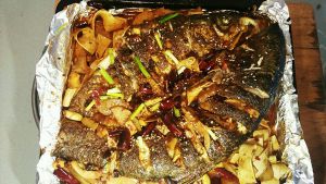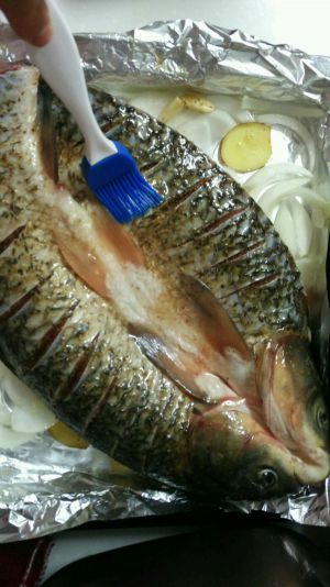 烤箱预热10分钟,烤盘放锡纸,涮一层油,放上鱼烤20分钟,这中间可以炒配菜,炒7分钟熟