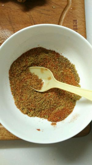 5勺辣椒粉,5勺孜然粉,5勺花椒粉,盐适量搅拌在一起,备用