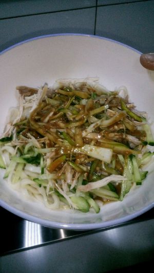 从冰水中捞出凉面放入盆中。半根黄瓜擦成丝,再擦少许胡萝卜丝,再将撕好的鸡丝加入里面。