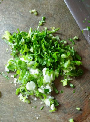 葱一勺+蒜末一勺+辣椒面一勺+白芝麻一勺淋热油搅拌均匀后