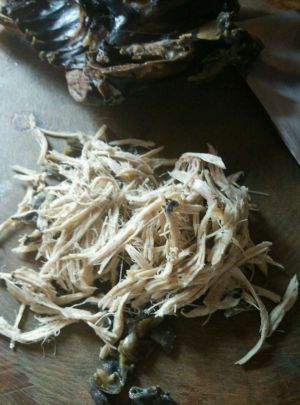 鸡蛋取一个煮熟去皮,另外的打散摊成鸡蛋皮,将鸡蛋皮切宽条。