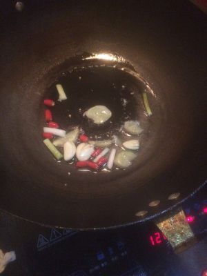 锅内油六成热的时候,放入葱姜蒜炒出香味,加入辣椒丝炒硬,微糊。