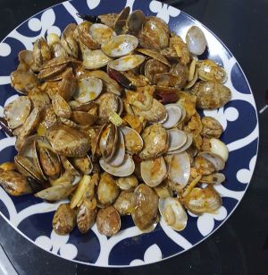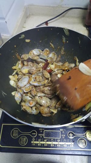 葱姜蒜干辣椒爆锅,放入花蛤翻炒,然后盖盖儿闷。