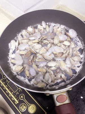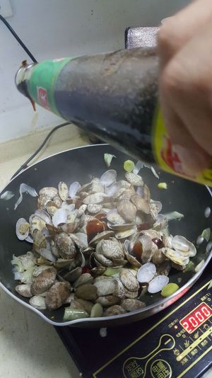 放入花蛤,里面加入料酒、耗油、盐,翻炒片刻后淋入原汤。