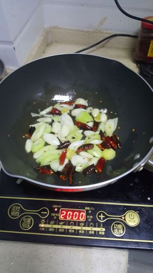 锅中先放入干辣椒,5~8秒后加入葱姜蒜爆香。